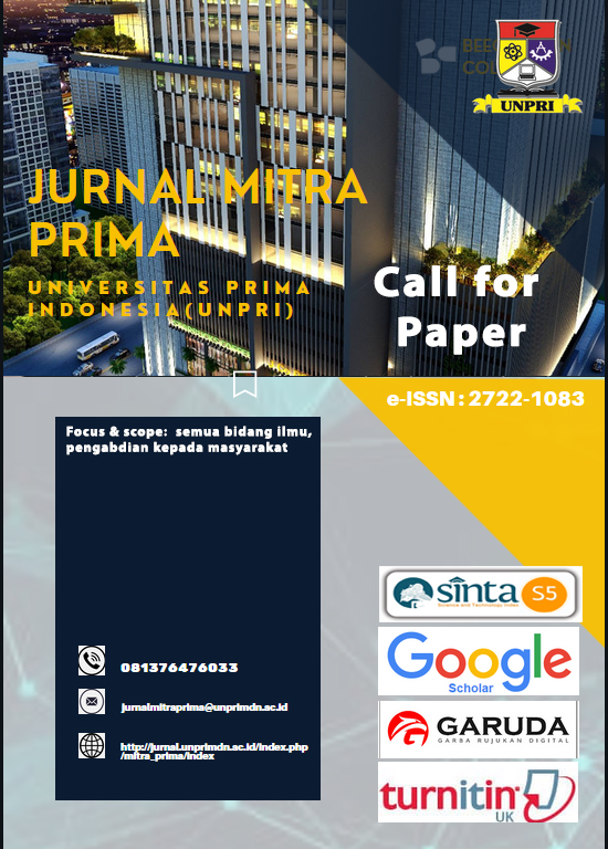 This journal contains the results of community service and empowerment activities in the form of applying various fields of science, including education, engineering, agriculture, social humanities, computers, Industrial Engineering, Electrical Engineering, Economics, Business Management, Accounting and Health. Jurnal Mitra Prima is published twice a year in April and October. Jurnal Mitra Prima has been indexed on Google Scholar, Garuda